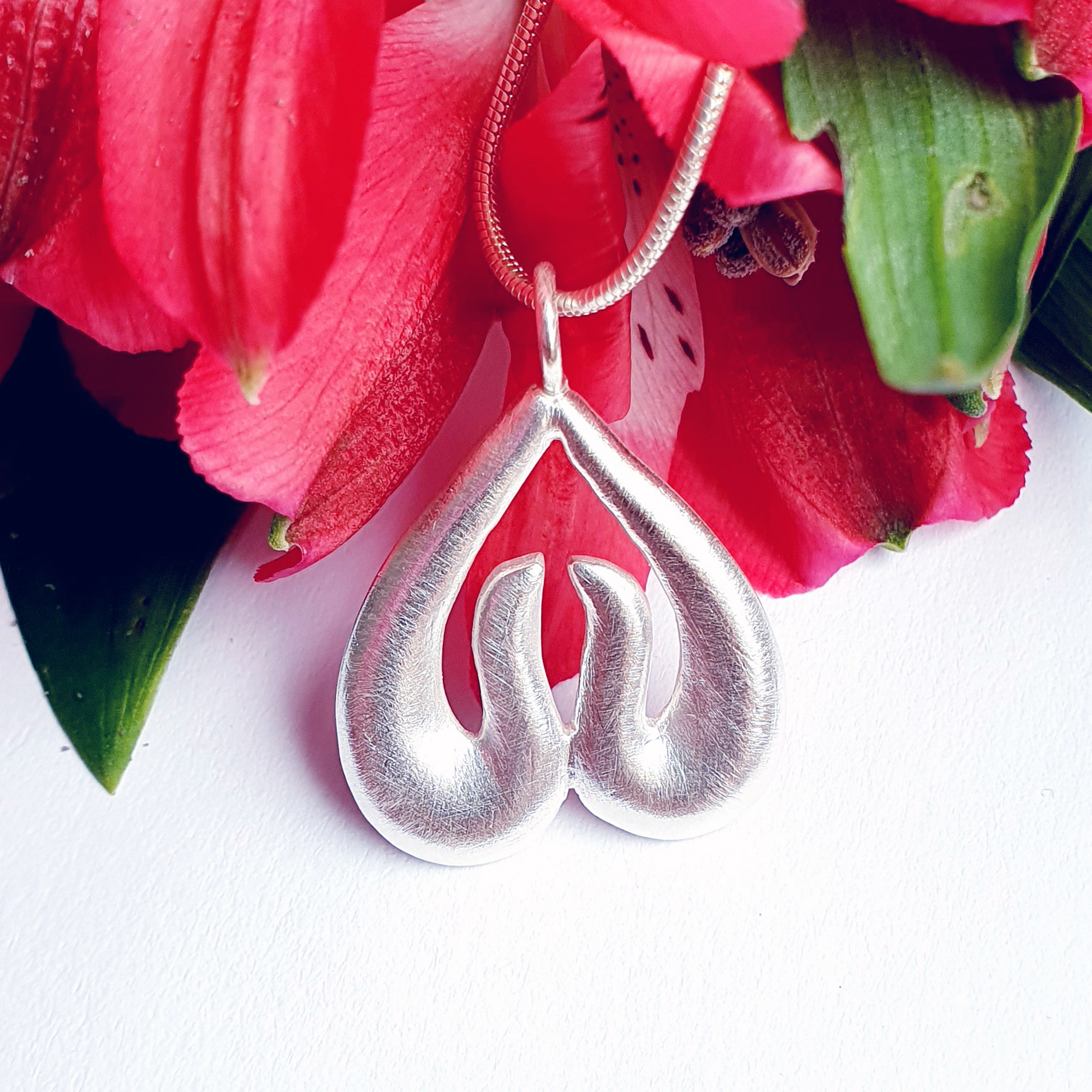 Diesen außergewöhnlichen Anhänger mit einem stilisierten Namaste-Gruß in Herzform habe ich in meiner Schmuck-Manufaktur aus 925 Silber für Dich von Hand gefertigt. Die Oberfläche des silbernen Namaste-Symbols ist edel mattiert.