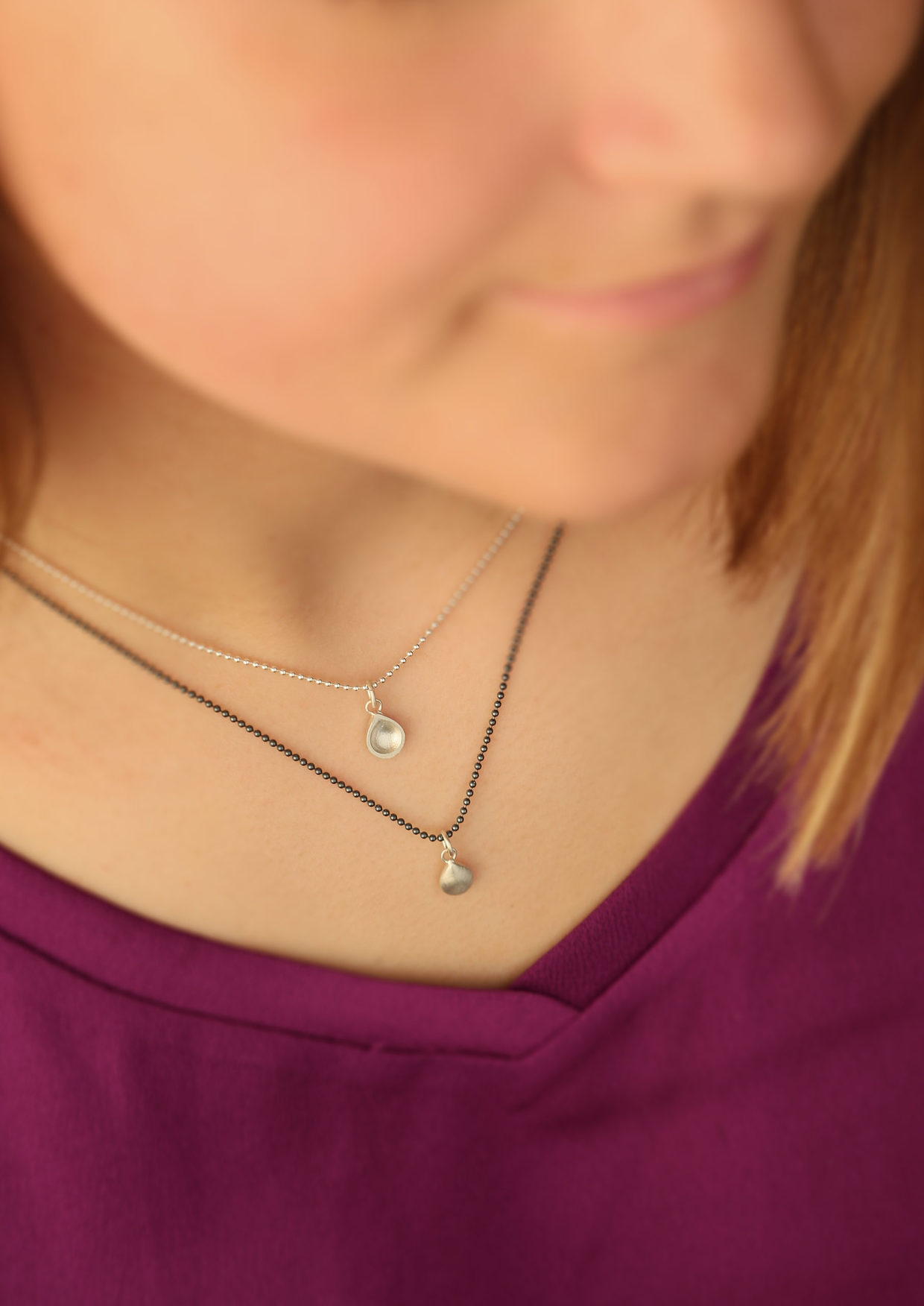 Der silberne Tropfen-Anhänger wird pur, ohne Kette, geliefert. Wenn Du eine passende Silberkette zum Tropfen-Anhänger benötigst, lass mich das einfach über das Anmerkungsfeld des Online-Shops wissen oder schreib mir eine kurze Email. Ich schlage Dir dann gerne Ketten aus 925 Silber vor, die zum Anhänger, zum Empfänger und zum Anlass passen – für Dein ganz individuelles Schmuckstück.