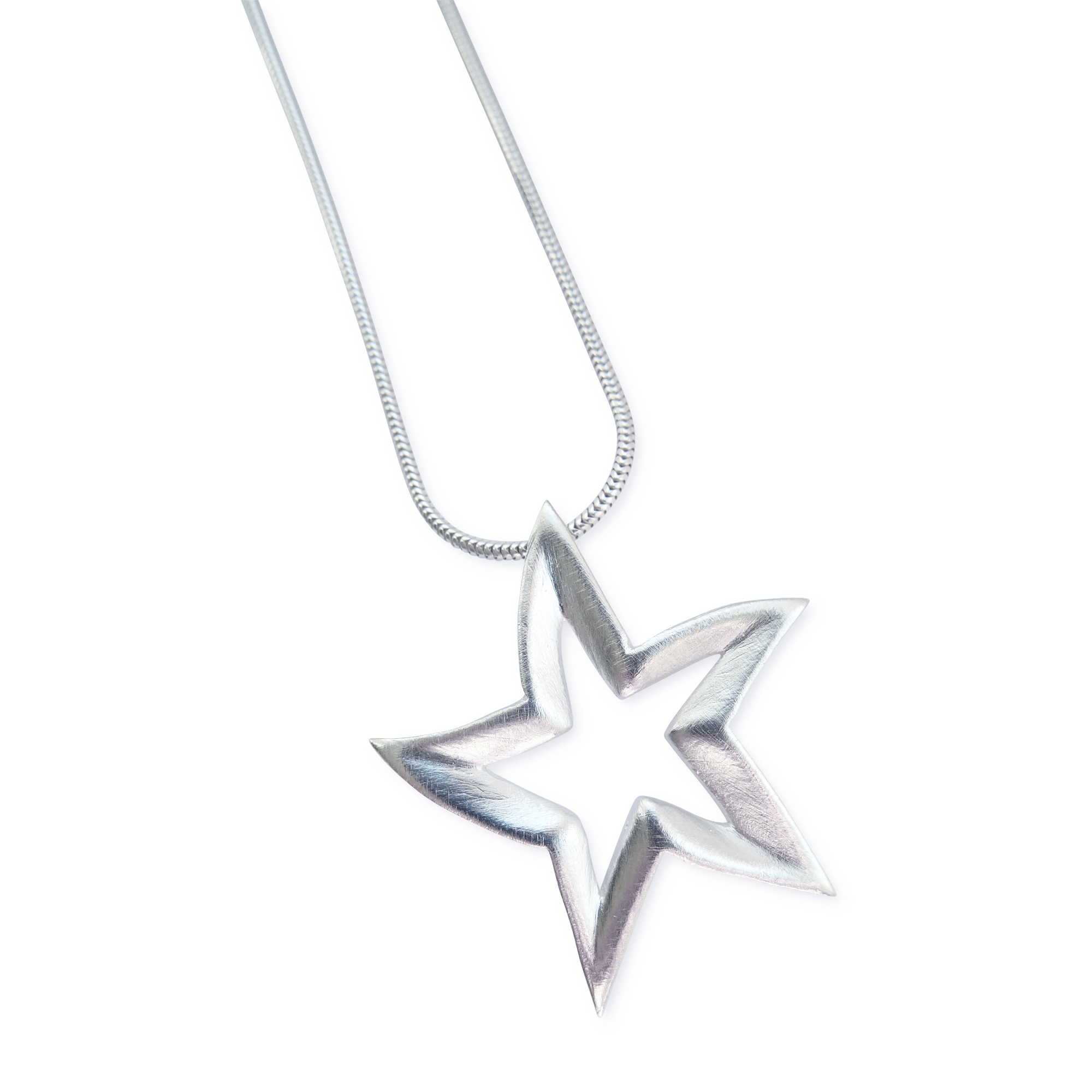 Der Stern-Anhänger hat eine Länge von 33 Millimetern und ist 29 Millimeter breit. Das macht ihn zu einem idealen Solisten, der an einem silbernen Reif ebenso gut zur Geltung kommt wie an einer Silberkette – echter Statement-Schmuck. Kombinieren lässt sich der silberne Stern sowohl lässig zur Jeans als auch edel-elegant zum Abendkleid.